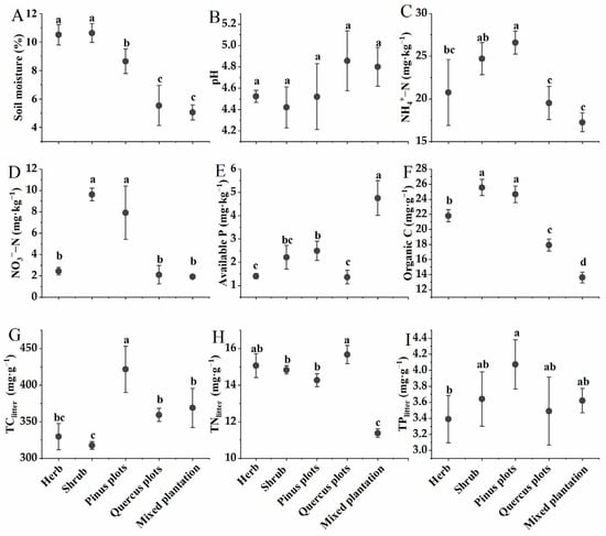 Figure 1. Descriptive statistics of soil and litter properties. TClitter: litter total carbon, TNlitter: litter total nitrogen, TPlitter: litter total phosphorus. (AF) Soil physical and chemical indicators. (GI) Litter nutrition indicators. Values are the means ± standard error. The different letters indicate significant differences between treatments according to the Tukey test; lowercase letters (such as a, b, c, d) indicate significant differences (p < 0.05) among the five sampling plots.