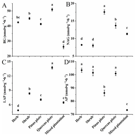 Figure 2. Changes in the extracellular enzyme activities. (A) The soil C-acquiring enzyme BG (β-1,-4-glucosidase), (B) The soil N-acquiring enzyme NAG(β-1,4-N-acetylglucosaminidase), (C) The soil N-acquiring enzyme LAP(L-leucine aminopeptidase), (D) The soil P-acquiring enzyme AP(alkaline phosphatase). Values are the means ± standard error. The different letters indicate significant differences between treatments according to the Tukey test; lowercase letters (such as a, b, c, d) indicate significant differences (p < 0.05) among the five sampling plots.