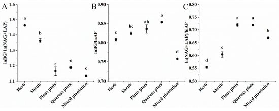 The contents of extracellular enzymes with activities in C, N, and P acquisition differed among the different vegetation communities (Figure 2). The highest level of AP in soil was observed in the herb plots, while the level of the N-acquiring enzymes of LAP and NAG were lower in these plots than in the forest plots, indicating that the soil microorganisms in the herb plots had more P requirements and fewer N requirements than those in the forest plots. The highest BG and LAP activities in soil were observed in the Quercus plots, indicating that the soil microorganisms in these plots had more C and N requirements. NAG activity was higher in the Pinus plots than in the other plots, indicating that the Pinus plots required more N to maintain microbial nutrient balance.