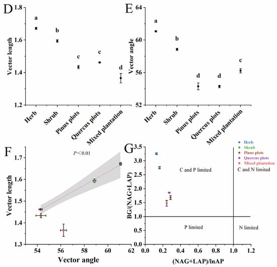 Figure 3. Extracellular enzyme stoichiometry of the relative proportions, (AE) Changes in extracellular enzyme stoichiometry, vector length, and vector angle were calculated according to the ratios of the log-transformed BG, NAG + LAP, and AP. (F) Linear regression analysis to identify the relationships of microbial C limitation with microbial N or P limitation. Longer vector length indicates greater C limitation. A vector angle of <45° denotes N limitation; angles >45° denote P limitation. (G) Stoichiometric analysis of soil enzyme activities to identify potential P and N limitations in soil: by using 1 as a horizontal and vertical baseline along the axis of enzyme activity ratios ((NAG + LAP)/AP as the x-axis and BG/(NAG + LAP) as the y-axis), four quadrants representing microbial resource limitations (N limitation, P limitation, C and P limitations, and N and P limitations) were categorized. The different letters indicate significant differences between treatments according to the Tukey test; lowercase letters (such as a, b, c, d) indicate significant differences (p < 0.05) among the five sampling plots.