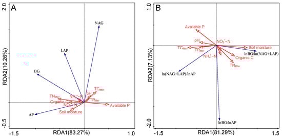 Figure 4. Redundancy analysis (RDA) used to identify the relationships between soil extracellular enzymes and soil and litter properties (A) and between soil extracellular enzyme stoichiometry and soil and litter properties (B).