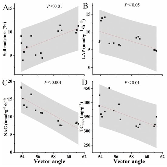 Figure 5. Linear regression analysis between the soil physical properties (A), soil extracellular enzymes (B,C), litter nutrients, (D) and vector angles. Red lines indicate the model fits between the vector angles and the properties; grey areas represent the 95% confidence intervals of the models.