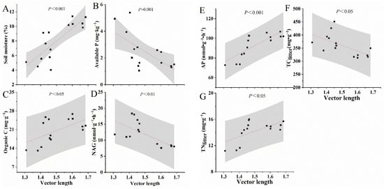 Figure 6. Linear regression analysis between the soil physical properties (A), soil nutrients (B,C), soil extracellular enzymes (D,E), litter nutrients, (F,G) and vector lengths. Red lines indicate the model fits between the vector lengths and the properties; grey areas represent the 95% confidence intervals of the models.