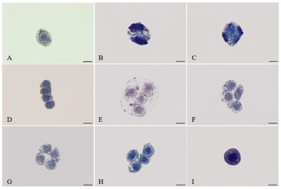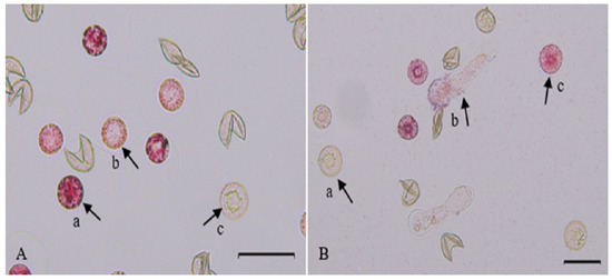 From 6 January to 13 March 2020, thirty male strobili of TD-5 were collected and measured daily. Then, they were fixed with a Carnot fixation solution consisting of V95% alcohol combined with V glacial acetic acid in a three-to-one ratio and stored in a refrigerator at −20 °C [31]. The development process of microspores was observed through the method of conventional squashing followed by Giemsa-staining [32,33], and photographed under an Olympus Vanox microscope at 100×. During microscopic examination, 30 pollen mother cells were randomly observed in each field, and at least 200 pollen mother cells were observed in each period.