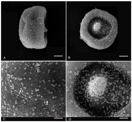 SEM photographs of pollen grains of T. distichum var. distichum. (A) Equatorial view at 4000×. (B) Polar view at 4000×. (C) Equatorial view at 10,000× showing pollen exine with microverrucate ornamentation (arrow a), on which many granular protrusions (arrow b) are observed. (D) Polar view at 10,000×. Bars: (A,B) 5 μm. (C,D) 2 μm.