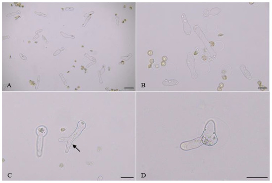 Pollen is the male gametophyte that carries plant genetic information and directly affects the breeding efficiency of crops [1,2], vegetables [3,4], fruits [5,6] and trees [7,8]. Its viability has an important impact on fertilization [9], embryo development [10] and seed quality [11]. The viability and longevity of plant pollen varies with species and environmental conditions [12]. The three main methods to test pollen viability include staining techniques [13,14,15,16], capacity to affect seed set [17,18] and in vivo and in vitro germination [19,20]. These methods each have advantages and disadvantages. The staining technique is simple and quick, but its results are often overestimated and may not show any correlation to the germination tests [21]. Determining pollen viability by seed set is the most authentic and accurate test, but it is environmentally sensitive, laborious and time consuming [12]. In vitro germination simulates natural pollination, so its detection results correlate with the fruit and seed sets [12,22]. Pollen culture in vitro allows not only the germination rate of pollen to be observed, but also the development of the pollen tube to be monitored [12]. However, the conditions of pollen germination in vitro vary with different plant species, so it is necessary to study the optimal medium composition and concentration for each species [1,23,24]. Artificial culture media are dependent on species, and examples include soybean requires 15 g of sucrose, 0.03 g of Ca(NO3)2, and 0.01 g of H3BO3 in 100 mL of deionized water [1], the medium of Vitis vinifera which contains 15% sucrose and 1% agar [23], and the optimal medium for pollen germination of Keteleeria fortunei contains 240 g/L sucrose, 70 mg/L CaCl2 and 210 mg/L H3BO3 [24].