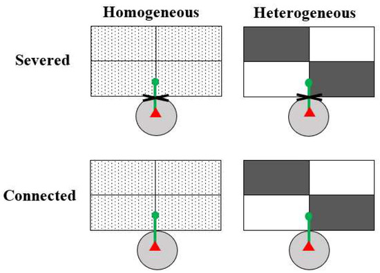 Schematic representation of the experimental design. Each box consisted of four equal patches. In the heterogeneous treatment, two patches in a box were filled with a high-nutrient soil (gray rectangles) and the other two with a low-nutrient soil (white rectangles); in the homogeneous treatment, all four patches in a box were filled with an even mixture of the high- and the low-nutrient soils at a volume ratio of 1:1. A mother ramet (red triangle) was grown in a pot (light gray circle) and its first daughter ramet (green dot) was grown at the short edge of the two adjacent patches. The internode (thick green lines) between the mother and the first daughter ramet was either severed to prevent clonal integration or kept connected to allow clonal integration.