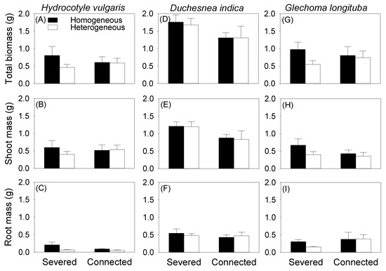 Effects of soil heterogeneity (homogeneous vs. heterogeneous) and clonal integration (severed vs. connected) on total mass (A–C), shoot mass (D–F), and root mass (G–I) of the mother ramet of each species.