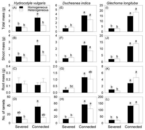 Effects of soil heterogeneity (homogeneous vs. heterogeneous) and clonal integration (severed vs. connected) on biomass (A–C,E–G,I–K) and number (D,H,L) of the offspring ramets of each species growing in the box. Error bars indicate +1 SE. Different letters indicate significant differences (Tukey HSD tests).