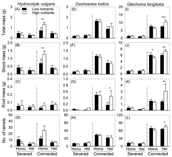 Effects of soil heterogeneity (homogeneous vs. heterogeneous), clonal integration (severed vs. connected) and patch quality (high- vs. low-nutrient patches) on biomass (A–C,E–G,I–K) and number (D,H,L) of the offspring ramets of each species growing in the box. Error bars indicate +1 SE. Symbols (* p < 0.05, ** p < 0.01 and *** p < 0.001) indicate significant differences between the high- and low-nutrient patches within the box (by linear contrasts).