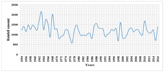 The RANG correlation test was performed on the rainfall series from 1954 to 2016. The result shows that the rainfall series is random at the level of 99% confidence and the value of the computational variable is −1.6904.