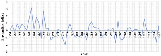 : is the mean amount of precipitation, Xi is the amount of rainfall in the year I; represents the standard deviation. Positive values indicate rainfall excess while negative values indicate rainfall deficits.
