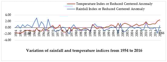 Variation in rainfall and temperature indexes from 1954 to 2016.