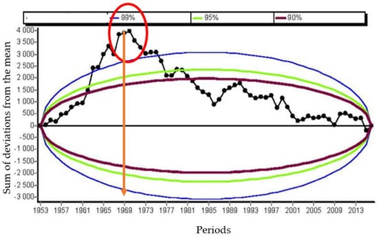 The result of this test shows in Figure 7 that there is only one break localized around the year 1969 at the level of 99% confidence as highlighted in red.