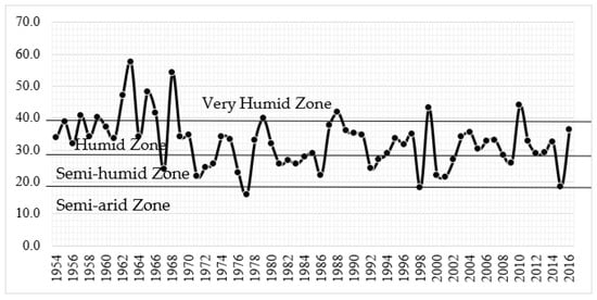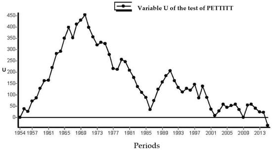 The result of the failure identification test using the nonparametric method of PETTITT on the rainfall series from 1954 to 2016 (Figure 8) shows that the rainfall series presents a probability of exceeding the critical value of the test of 1.54 × 10−2 in 1970 at the level of 99% confidence.