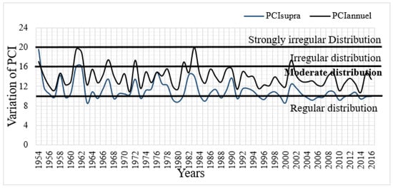 Calculation of the precipitation concentration index (PCI) is a useful indicator for estimating the monthly heterogeneity of precipitation. It has been calculated on a supra-seasonal and annual basis according to the following formula according to []: