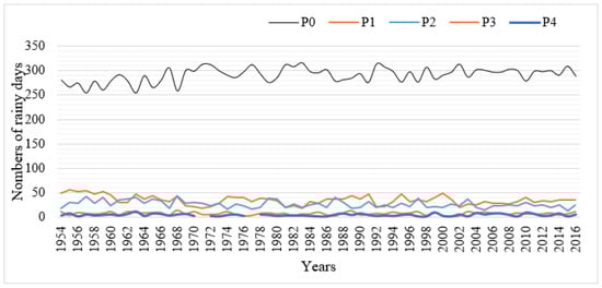 The number of rainy days per year was calculated from the daily rainfall data. Any day of the year that receives an amount of precipitation more than or equal to 1 mm was considered to be rainy. Then, the average number of rainy days was calculated on both sides of the break dates. This allowed the deficits of the post-break period versus the pre-break period to be assessed in terms of the number of rainy days. The characterization method consisted of calculating, for southeast Benin, the frequency of the daily precipitation classes on either side of the break date in the annual series. The different classes were defined according to the number of rainy days with a height of between 1 and 10 mm (P1), 10 and 30 mm (P2), 30 and 50 mm (P3) and more than 50 mm (P4). This typology of daily precipitation was linked to the international threshold standards defined by the World Meteorological Organization [] and then taken up by [] in their studies.