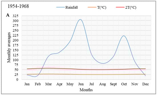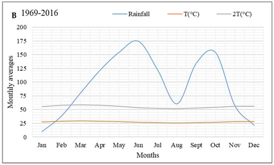 A given month was considered to be dry when P < 2T, that is to say when the evapotranspiration potential (TPE) was more than precipitation. Conversely, when P > 2T, the month was considered wet. To identify the “dry” and “wet” months and highlight the periods of drought in a locality, we generally drew ombrothermal diagrams. These diagrams used the two curves of temperature and precipitation for the 12 months of the year, which has made it possible to define an ombrothermal area. The larger the area, the drier the season [].