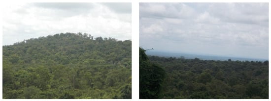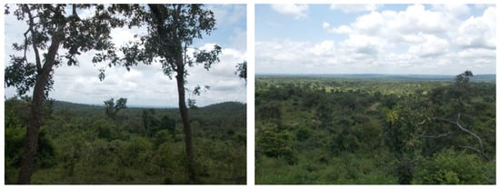 Tropical forests are vulnerable to climate change and adaptation is necessary to reduce their vulnerability []. Indeed, climate change has significant negative impacts on the natural environment, specifically the loss of forest and biodiversity []. Over the past decades, the levels of carbon dioxide (CO2) and other greenhouse gases in the Earth’s atmosphere have increased dramatically from the burning of fossils and other human activities []. Changes in the climate and the concentration of carbon dioxide therefore undoubtedly affect the structure and function of ecosystems and the ecological interactions of species and their ranges, with definite consequences for biodiversity []. Thus, current trends in climate change affect species and their ecosystems and lead to the reduction of ecosystem services in forests []. This loss of ecosystem services will also reduce human well-being at all scales []. It is in this context that forests in general are essential to mitigate the impacts of global climate change because of their important role in carbon sequestration []. In general, forests provide an important basis for creating and safeguarding living communities that are the most resilient to variations in climatic parameters []. This resilience reflects the capacity of an ecosystem such as the forest or the living communities to absorb the disturbance and to reorganize itself while undergoing change in order to always and essentially maintain its same function, structure, identity and feedback []. Faced with climate change, the two fundamental answer options provided for this purpose are respectively mitigation and adaptation. Mitigation refers to controlling global climate change by reducing greenhouse gas emissions and improving carbon sinks, while adaptation mainly focuses on moderating the impacts of climate change through a broad range of actions targeted on the vulnerability system []. Adaptation thus aims to reduce vulnerability, the degree to which the ecosystem is unable to cope with the adverse effects of climate change, including climate variability in its extremes [,].