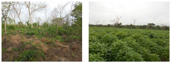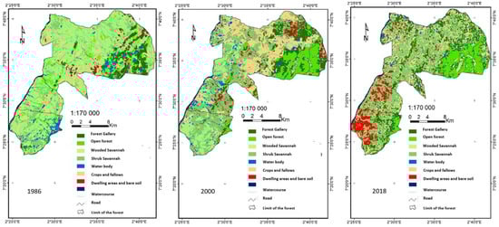 Refs. [,] showed in their studies of the dynamic of land use within the forest of Dogo-Kétou in the period from 1986 to 2000 that open forest and tree savannas had decreased while gallery forest, wooded savannas, shrub savannas and fields and fallows had increased. This analysis confirms the results made within the framework of this study during this same period with regard to the trends recorded. However, in 2014, [] demonstrated that formations of the forest of Dogo-Kétou were unevenly distributed and under pressure from crops and fallow land and natural risks related to flooding with relatively significant deforestation and variable vulnerability of plant formations to fragmentation. The land cover consisted of forest gallery (37.16%), open forest (9.99%), wooded savannas (25.74%), tree savannas (0.47%), shrub savannas (2.93%), ferralitic soils (2.63%), ferruginous soils (16.33%), crops and fallow land (3.50%) and water (1.24%). The dominant formations of the vegetation being the gallery forest and the wooded savannas in 2014. But in 2018, this study confirmed that the areas of agglomerations have greatly increased reaching 7.8% of the forest area; tree and shrub savannas have also increased in area from 12.1% in 2000 to 38.9%. This increase could be explained by the impact of population growth, which has accentuated the deforestation of dense formations such as gallery forests and wooded savannas, since the latter fell from 52.6% in 1986 to 36.1% in 2000 then to 4.3% of the forest area in 2018. The wooded savannas have therefore almost disappeared with the increase of shrubby savannas. Indeed, the regression of dense natural forests has changed the landscape cover of the classified forest of Dogo-Kétou. Within the framework of participatory forest management, some vegetations as savannas were cultivated in the forest studied. The forests were invaded by populations who have their homes in permanent materials and schools in this forest. It was therefore evident that the regressive dynamics of the vegetation cover were strongly linked to anthropogenic factors accentuated by the effects of climate change []. The authors of [] have shown that the more the environment is degraded, the less it is diversified in species. The regression of natural forest vegetation has changed the landscape cover of the classified forest of Dogo-Kétou. At the same time, soil erosion, degradation of forest resources and desertification, slow and potentially irreversible processes, threaten food security and continue to amplify in response to the increase in extreme climate events and human pressures [,,]. These results agree well with those of [] and [] obtained in southeast Benin. The study of [] based on an inventory of the forest of Dogo-Kétou has shown a low Shannon floristic index between 2.80 and 3.58 bits and confirmed that this forest was exposed to strong anthropogenic pressures, which prevent the establishment of a mature dense forest in the southeast of Benin. [] have confirmed that the analysis of the diameter structures revealed a lack of big trees with a dimeter superior than 45 cm, which are both mature and seed trees capable to ensure a good regeneration of the forest in the future. This study has confirmed the disappearance of dense forest formations.