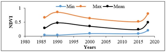 The interrelationships between climate and land use have been assessed in this study. It allowed evaluation of the state of degradation of the natural forest of Dogo-Kétou and the real impacts of global changes as obtained through surveys among local populations in southeast Benin []. The Normalized Vegetation Index (NDVI) reflects the health of the vegetation based on its cover density as well as its reflectance of sunlight. Indeed, the region of southeast Benin is experiencing visible transformations due to anthropogenic pressure accentuated by climate change. Analysis of satellite images has confirmed that for nearly 30 years the forest of Dogo-Kétou has suffered a sharp reduction in its density and forest cover. The results of this study reveal from 1986 to 2018 a regression of dense forests. In fact, over the period from 1990 to 2018 the normalized maximum vegetation index decreased from 0.9 in 1990, reflecting a high density of trees, to 0.6 in 2018. This period of decrease corresponds to a period where the local populations have reported the perceived impacts of climate change and human actions exerting simultaneously on the forest during the last decades []. Indeed, the pluviometric deficits noted through the decrease in rainfall have serious consequences on the vegetation. These rainfall deficits have increased the mortality of forest trees, making regeneration more difficult, destroying the grass cover, which was very sensitive to the lack of water, and increasing the pressure on surviving trees []. This explains the various changes observed in the occupation and land use classes. A change in one element of the ecosystem has an effect on the other component []. Understanding land use changes will impact policy for decision-making for an effective sustainable management of ecosystems, and this was how several authors have described the processes of land use dynamics in Benin [,,]. However, the results of the present study have revealed from 1986 to 2018, a regression of dense forests and wooded savannas in favor of shrub savannas, agglomerations and bare soils. These results agree with those of [,]. The latter specified that under conditions characterized by a relatively high frequency of dry years, there is the destruction of mostly woody vegetation and an increase in the infiltration of rainwater and the appearance of species from dry areas. For [], seasonal attacks on forest vegetation by breeders in search of fodder and water resources were one of the main causes of the decline of dense natural vegetations. In addition, the population growth rate in the study, estimated at 4.02% from 2000 to 2013 [], also reflects that strong pressure on natural resources and could also lead to considerable degradation if sustainable management measures of these ecosystems are not implemented.