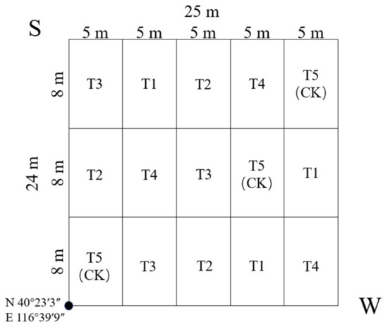 T1–T5 was distributed in the 15 blocks randomly, and each treatment was repeated 3 times in the plot (Figure 2). From September, fertilizer was applied to the soil surface in the plot. The volume of the fertilization was 900 g·m−2, and the fertilization method was circular application (within 0.5 m of trunk radius), except for T5 (CK) without any fertilization.