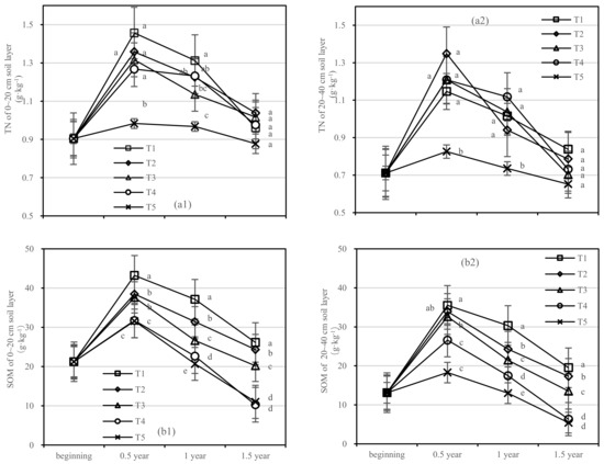 Soil TN and SOM in four periods under five fertilization types. Data are the mean content ± standard deviation. Letters represent differences (α = 0.05). T1: adjustment of C/N and C/P + 0.2% priming; T2: adjustment of C/N and C/P + 0.2% common compost; T3: adjustment of C/N and C/P; T4: raw material grinding of thinning shreds; T5: no fertilization. Additionally, (a1,a2) and (b1,b2) describe the contents of soil total nitrogen (TN) and organic matter (SOM) in the 0–20 cm and 20–40 cm soil layers, respectively.
