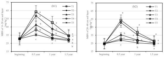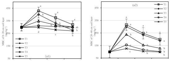 The soil MBC of T1 and T2 decreased rapidly after one-year fertilization, while T3–T5 had a small amplitude. After half a year of fertilization, the MBC content of T1 was 1.4 times higher than that of T5 in the 0–20 cm soil layer, and the MBC content of T2 was only 275.88 mg·kg−1 (Figure 5(a1)). After 1.5 years of fertilization, the MBC content of T1 was two times higher than that of T5, and T2 was 2.7 times higher than that of T4 in the 20–40 cm layer (Figure 5(a2)).