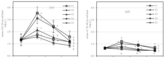 Soil urease was negatively correlated with composts in the 0–20 cm layer; however, the application of compost had no response to soil urease activity in the 20–40 cm layer. The difference range of T1 and T5 in urease was 0.71–1.98 mg·kg−1, and that of T2 and T5 was 0.39–1.55 mg·kg−1 (Figure 6(a1)). The coefficient of correlation was not found to be significant between T1 and T2 in the 20–40 cm layer.