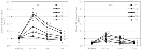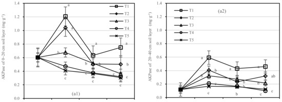The changing trend of AKPase activity of T1–T5 in the 0–20 cm and 20–40 cm soil layers was similar. Compared with 1 year after fertilization (Figure 7a), the AKPase activity of T1 and T2 increased slightly after 1.5 years of fertilization, and T2 showed the largest change. There was no significant difference between T4 and T5, and the changing trend of T3 was stable relatively.