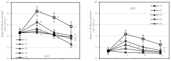 The T1 had a higher quantity of fungi than other treatments (Figure 8a). With the increase in application time, the number of fungi in T3 decreased in the 0–20 cm soil layer rapidly and varied from 1.222 to 2.445 (104, CFU·g−1) in the 20–40 cm layer. After 1.5 years of fertilization, the number of fungi in T1 was 2.2 times higher than that in T3 in the 0–20 cm soil layer and was 2.8 times higher than that of T5 in the 20–40 cm layer (Figure 8a). The number of fungi in T3–T5 was lower than that before fertilization.