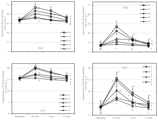Quantity of soil fungi, bacteria, and actinomycetes in four periods under five fertilization types. Data are the mean content ± standard deviation. Letters represent differences (α = 0.05). T1: adjustment of C/N and C/P + 0.2% priming; T2: adjustment of C/N and C/P + 0.2% common compost; T3: adjustment of C/N and C/P; T4: raw material grinding of thinning shreds; T5: no fertilization. Additionally, (a1,a2), (b1,b2) and (c1,c2) describe the soil fungi, bacteria, and actinomycetes in the 0–20 cm and 20–40 cm soil layers, respectively.