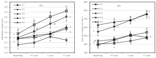 Individual volume and unit area volume of Pinus tabuliformis in four periods under five fertilization types. Data are the mean content ± standard deviation. Letters represent differences (α = 0.05). T1: adjustment of C/N and C/P + 0.2% priming; T2: adjustment of C/N and C/P + 0.2% common compost; T3: adjustment of C/N and C/P; T4: raw material grinding of thinning shreds; T5: no fertilization. Additionally, (a,b) describe the individual volume and unit area volume, respectively.