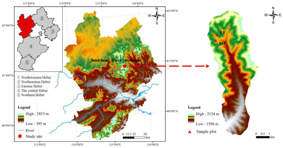The study site is located in the Taizicheng River catchment in the mountain area of northwestern Hebei, China (Figure 1, Table 1). The study site belongs to the cold temperate sub-arid zone of the continental monsoon climate [17]. Due to the climate being rather mountainous, the temperature rises quickly, and precipitation is poor in spring (May–June). Summer (July–August) is cool and short, with a significant temperature difference between day and night and concentrated rainfall. The first frost appears earlier in autumn (September–October). Cold air is frequent in winter (November–April). The vegetation period in the mountain area of northwestern Hebei is about 90 days. Over a year, the average temperature is 3.7 °C, and the average precipitation is 483.3 mm. More than 2100 species of terrestrial wild plants belong to 513 genera and 120 families in the northwestern Hebei (Zhangjiakou Municipal People’s Government; www.zjk.gov.cn accessed on 19 April 2021).