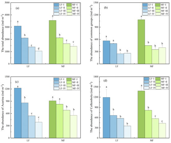 The soil fauna community tended to gather on the soil surface in the vertical distribution (Figure 2). In the LF, the abundance of total soil fauna and dominant groups in soil layer I differed significantly from that in layer II (p < 0.05), and the difference between adjacent soil layers III and IV was at the least significant level (p < 0.05). The surface aggregation of soil fauna in the MF was more pronounced than that in the LF except for Acarina in Figure 2, indicating that the soil surface of the MF provided more ample food resources. The surface aggregation of the common groups in the MF was the most significant level in Figure 2 (p < 0.05), and the abundance advantage of common groups in the MF was mainly in layer I compared with the LF.
