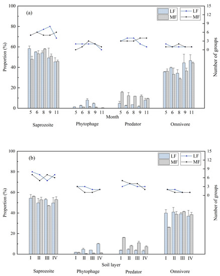 Dividing the soil fauna into different functional groups based on the food source, feeding mode, and life history strategy can facilitate the study of the function of the soil fauna groups in the ecosystem [38,39]. The responses of different functional groups to environmental changes result in a different distribution of each functional group among the stands [40,41,42]. The proportion of predatory functional groups in the MF was higher than that in the LF, and the range of variation was low, indicating that the predatory soil faunas were at a higher trophic level in the food chain, and the community stability was high. Phytophagous soil fauna had a strong response to seasonal dynamics owing to their feeding habits.