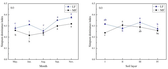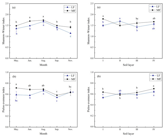 The diversity of the soil fauna in the MF was higher than that in the LF, with both showing the same dynamic trend over time (Figure 4). The changing curves of the Shannon–Wiener index (H) were both inverted U-type in the two sampled forests; that is, they reached their highest values in early August. The variation trend of the Pielou evenness index (J) was opposite to that of the Simpson dominance index (C) in the two sampled forests, showing the W and M types, respectively. The tendency of the soil fauna diversity differed between the LF and the MF (Figure 4). The Shannon–Wiener index (H) was the highest in layer II (H; 1.69) in the LF, whereas highest (H; 1.80) in layer I in the MF.