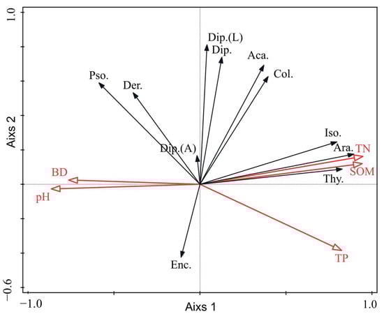 Redundancy analysis between main groups of the soil fauna and the selected properties of soil. Red arrows represent soil properties labeled as: soil bulk density (BD), soil pH value (pH), soil organic matter (SOM), total nitrogen (TN), and total phosphorus (TP). Black arrows represent groups of soil fauna labeled as: Acarina (Aca.), Araneae (Ara.), Collembola (Col.), Dermaptera (Der.), Diplopoda (Dip.), Diptera adult (Dip. (A)), Diptera larvae (Dip. (L)), Enchytraeidae (Enc.), Isoptera (Iso.), Psocoptera (Pso.), and Thysanoptera (Thy.).