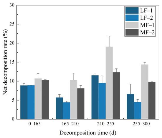 The net decomposition rate of litter during the decomposition process was calculated (Figure 6). During litter decomposition, the net decomposition rates of litter gradually increased from 0 to 210 d and gradually decreased after 210 d in both forest types. The cumulative decomposition rate of litter with different mesh sizes was MF–1 (54.52%) > MF–2 (40.64%) > LF–1 (32.81%) > LF–2 (27.41%), and the soil fauna activity improved litter decomposition rate. With the same mesh size, the cumulative litter decomposition rate in the MF was significantly higher than that in the LF (p < 0.05), indicating that litter quality is an essential factor affecting the litter decomposition rate.