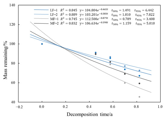 The residual mass rates and decomposition times fit the Olson exponential decay model (Figure 7). LF–2 (R2 = 0.889) had the best fitting effect, whereas MF–1 (R2 = 0.745) had the poorest. The litter decomposition rate in the 4 mm litterbags was faster than in the 0.01 mm litterbags in the same forest type. The decomposition in the 4 mm litterbags in the MF was the fastest, with decomposition times of 0.789 a and 3.408 a for 50% and 95%, respectively. The decomposition in the 0.01 mm litterbags in the LF was the slowest, with a residue rate of 72.591% after 300 a of decomposition, and decomposition times of 1.810 a and 7.822 a for 50% and 95%, respectively.