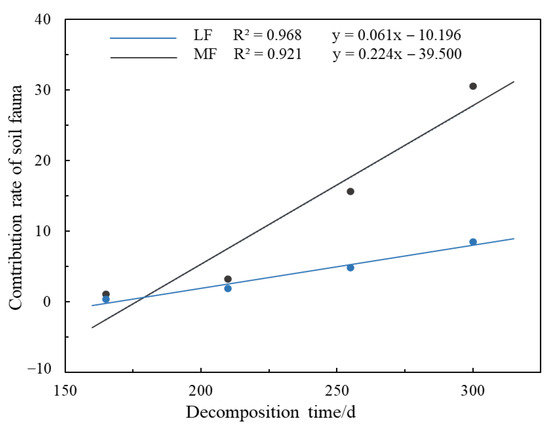 As decomposition progressed, the contribution rate of the soil fauna to litter decomposition showed an increasing trend (Figure 8). The contribution rate of the soil fauna was positively correlated with the decomposition time. The litter decomposition rate was different between the LF and the MF, and the contribution rate of the soil fauna to the MF (30.58%) was much higher than that of the LF (8.54%).
