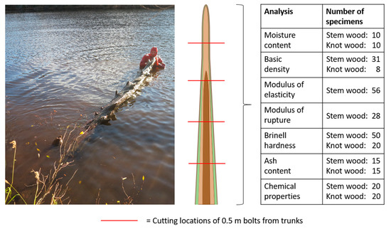 The retrieved trunks were cut into five 0.5 m-long bolts and sawn into 30 mm-thick planks (Figure 1 and Figure 2). After air-drying and conditioning at 20 °C and 65% relative humidity, specimens of stem wood were prepared from the planks for the following physical and mechanical property measurements: moisture content (MC), basic density (ρy), modulus of elasticity (Eb) and modulus of rupture (σb) in static 3-point bending, Brinell hardness (HB), colour, and ash content (AC). The basic density and the ash content were measured by the gravimetric method from intact parts of bending test specimens after the bending tests. Since the trunks, and subsequently the planks, contained large knots, knot wood specimens were also prepared from randomly selected planks of both trunks for analyses of MC, ρy, HB, and AC.