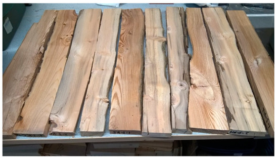 A set of unedged subfossil Scots pine boards prepared for the manufacturing of a physico-mechanical test specimen.