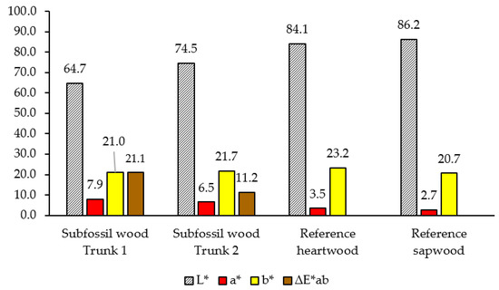 Lightness (L*), redness (a*), and yellowness (b*) values of air-dried subfossil and recently grown (reference) Scots pine heartwood and sapwood [46], and the colour difference of wood (∆E*ab) between subfossil and recently grown Scots pine.