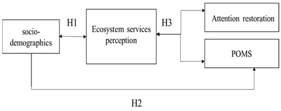 The main purpose of research is to explore the relationships between ES and forest healing benefit from the perspective of local people and participants, who are entering the protection forests. The socio-demographics include age, gender, education level, place of residence, and exercise habits. The perceived mental health includes Perceived Restorativeness Scale (PRS) and Profile of Mood States (POMS). The specific purposes are to examine whether: (1) the socio-demographics are related to perception of ecosystem services; (2) the socio-demographics are related to perception of mental health; (3) there are relationships between perception of ecosystem services and perceived attention restoration and mood states (Figure 1).