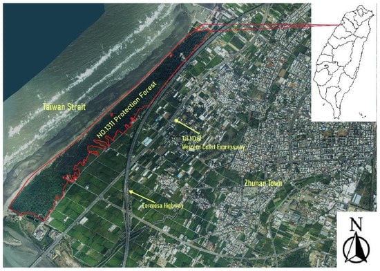The study site is Zhunan Protection Forest on the western coast of Miaoli County, Taiwan. (Figure 2). Due to leisure and recreation needs, the Miaoli County Government has planned the Zhunan Coastal Forest Recreation Area. The recreation area is divided into three districts: “Holiday Forest”, “Family Forest” and “Evergreen Forest”.