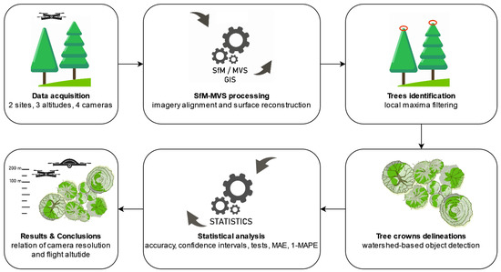 Study processing pipeline. Using four UAVs, data were collected at three different flight levels at two sites. The data were subsequently processed by SfM-MVS methods into the form of orthomosaics and digital surface/terrain models. Then, the treetops were automatically detected and the tree crowns were delineated using the lidR package in R. The accuracy of the automatic methods against the reference data was further evaluated statistically.