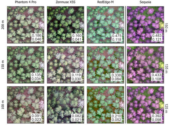 As far as the number of trees is concerned, all of the models observed a similar trend, i.e., that cameras with a higher resolution and larger sensor size were able to capture the forest canopy in more detail than those with a lower resolution and smaller sensors (the latter tended to smooth out slight vertical differences). Generally, sensors with higher spatial resolution, i.e., the Phantom 4 Pro and Zenmuse XS5, performed better at higher flight levels (150 or 200 m AGL), while the sensors with lower resolution (RedEdge-M and Sequoia) performed better at the lowest flight level (100 and 125 m AGL, respectively); see the descriptive statistics in Table 3.