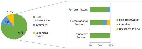 The sources of information for NC identification by auditors are as follows: field observations, document review, and stakeholders interviews. In the investigated sample, 78% of all H&S related NCs are identified through field observations, and 12% are detected by checking documents and procedures (Figure 3). Ten percent of the analysed NCs are identified using interviews and determining workers’ perceptions. Major NCs are identified only through field observation.