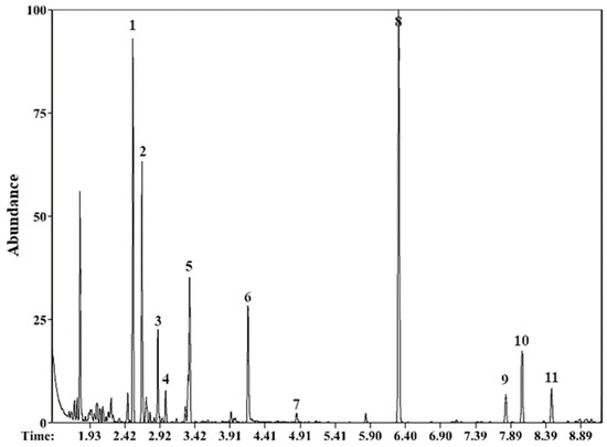 Sample chromatogram of fir foliar extract. Peak assignments are as follows: (1) α-pinene, (2) camphene, (3) β-pinene, (4) 3-carene, (5) D limonene, (6) maltol, (7) (-)-borneol, (8) bornyl acetate, (9) caryophyllene, (10) humulene, and (11) α-bisabolene.